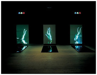 Stations is an installation of five channels of video projection and sound focusing on the image of the human figure submerged under water. Five cloth screens are suspended from the ceiling and underneath each lies slabs of granite that reflect the image. The figures are strongly lit to stand out against the dark backgrounds. The suspended bodies are upside down and seem to float in slow motion. The figures slowly drift out of frame, and then in darkness they plunge into the water in an explosion of light and turbulence. After a while it subsides and the cycle starts again. An initial experience of serenity is interrupted by a disturbing disorder that evokes a feeling of being between dream and death.